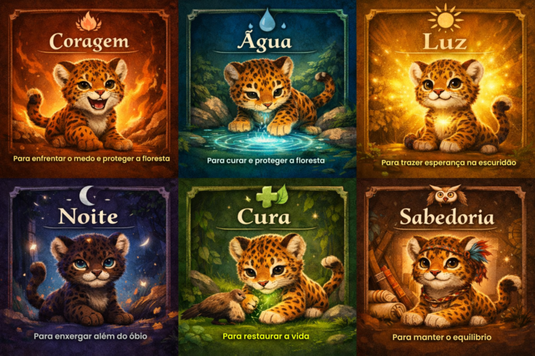 Oncinhas Guardiãs da Amazônia é uma história envolvente e poética que convida as crianças a explorar a floresta de uma maneira nunca antes vista. Cada página traz à vida oncinhas guardiãs, que possuem dons únicos e representam forças poderosas para a preservação e o equilíbrio da natureza.